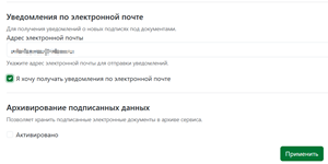 Активируйте эту функцию чтобы получить уведомление о получении новых подписей под документом. Введите адрес Вашей электронной почты в соответствующее поле. Нажмите на кнопку «Применить».