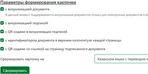 Просмотрите параметры формирования карточки. Карточку документа можно сформировать на Казахском и Русском языках. После нажатия на кнопку «Сформировать» карточка электронного документа будет скачана на Ваш компьютер. Эту карточку необходимо распечатать для предъявления в специальном ЦОН.